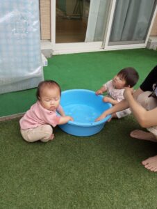 たらいに入った水をパシャパシャとして、顔にかかってもへっちゃらで、