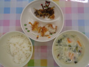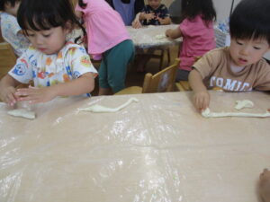 水や粉を加えながらこねこねしているうちに、程よい硬さになったのでみんなに配りました。いつもの油粘土とは匂いも硬さも手触りも違っています。それに気が付いて「いい匂いがする」「柔らかいね」などみんな感想を口にしながらお団子やヘビなどを作っていました。