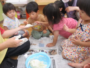 だんだん、ドロドロの状態になってきます。持ち上げて子どもたちの目の前に近づけると「わぁ」と少しのけぞります。好奇心旺盛なお友だちが指でチョンとつついているのを見て、他のみんなも安心したように触り始めました。