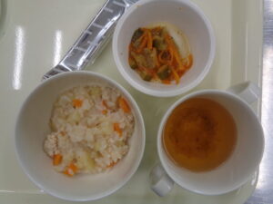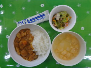 ・チキンカレーライス・玉ねぎとセロリのスープ・レタスサラダ・カルシウム強化ウエハース