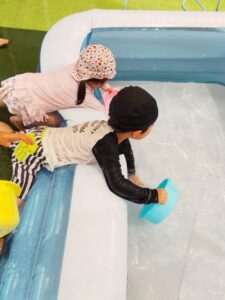 顔にかかってもへっちゃら!プールではワニ泳ぎ、フラフープトンネルくぐりなどしていますが、年少さんもとっても上手です。着替えも自分でして成長を感じます💕