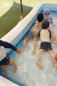 プールが始まった頃は水がかかることを嫌がっていたお友だちも、今ではへっちゃらです♡