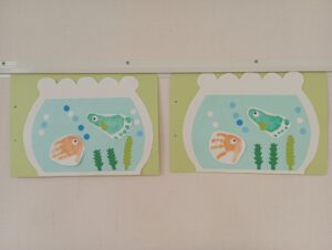 もも組さんは手形や足形で金魚鉢にお魚さんを泳がせてみました🐠.。o○