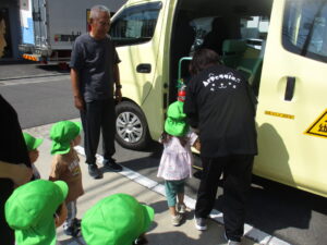 ふたば組さんは初めての園バスです。昨日、「明日はにじ組さんみたいにバスに乗ってお出かけするよ」とお話しすると皆の目がキラーンと輝き「えっ!バス?」と声が弾みました。今朝も「バスがお迎えに来てくれてるよ」と聞くと「黄色?」「バス?」とワクワクしているのが伝わってきました。