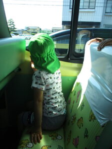 玄関に停まっているバスを見つけると少し緊張した表情になりました。運転手さんにご挨拶をして、保育者と一緒に乗り込んで席に座るととても嬉しそう。外を見る後ろ姿も真剣です。トラックやバイク、お家の人とお出かけした場所を見つけると友だちや先生に教えてくれます。