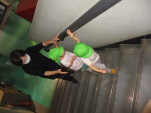 体育館に着くとバスを降りて大きな階段を上って会場に到着。先についていたにじ組さんに手を繋いでもらって広い場所で練習をすることができました。