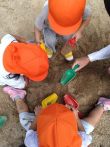 公園ではお山を作ったり型に砂を入れて遊んだりしました。お山づくりではお友だちと協力して一緒に砂をもったりする場面も見られ数か月前までは見られなかったコミュニケーションが芽生えてきているのだなとうれしい気持ちになりました。