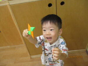 最近のふたば組さんは、お散歩に出かけている時も遠くに飛んでいる飛行機を見つけたり、少し先のお家の庭に咲いていたお花が無くなっていることに気が付いています。今日のたからさがしでもお部屋のいろいろな場所に目をやり、探していました。ふたば組さんの後半に入り、自分のすぐ近くの景色だけではなく少し離れた所にある物や景色に気が付くようになってきているんだなと成長を感じられて嬉しくなった時間でした。