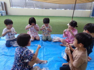 にじぐみさんも屋台でお買い物をして、買ったものは園庭で食べました。