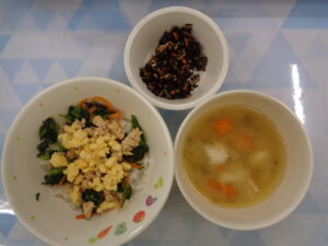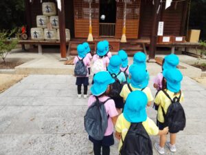 そしてダンスを頑張った後は、近くの神社にお散歩に行きました。どんぐり拾いや落ち葉拾いをして楽しみました。2つくっついたどんぐりを「さくらんぼみたいだね~」と嬉しそうに話したり、紅葉になった葉っぱを見つけたりと秋をたくさん感じることができました。