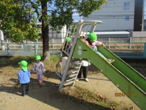11月も半ばにさしかかってきましたね。今日もいいお天気でお散歩日和でした。ふたば組のお友だちは電車が見える公園へでかけましたよ。お友だちと手を繋いで、てくてく歩いて行くと紅葉した木々が見えてきました。「あっ!赤い葉っぱがあるね🍁」「あそこが公園だよ!」公園に到着すると早速、すべり台へ向かうお友だち、葉っぱや実を拾いに行くお友だち、興味を持つ対象物がそれぞれ違っていて個性を垣間見ることができます。すべり台はきちんと順番を守って並んで待っていますよ。