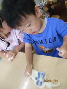 今日はふたば組さんで、水曜日に初めてのクッキングがあるので、型抜きの練習もかねて、小麦粉粘土をしました。