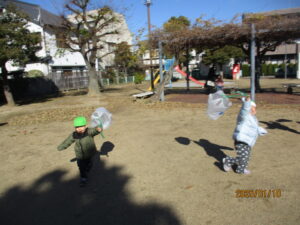 いつもの公園に着くと、保育者のたこをあげる見本をみて、「やりたい!」とやる気満々です。