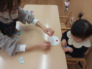 内科検診が終わった後、シール貼りの制作をしました。