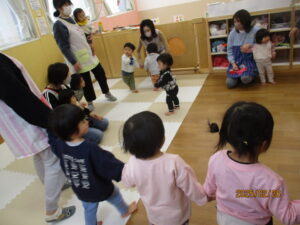かぶの収穫の後は少し時間ができたので園庭でむっくりくまさんをして遊びました。盛りだくさんのメニューをこなし、お腹がぺこぺこ(^_-)-☆