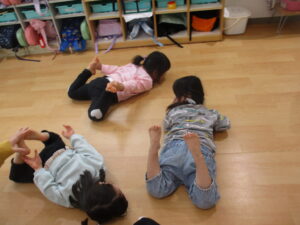 その後は、熊さんやうさぎさんになったり、けんけんやスキップで部屋の中を移動したり、長縄跳びを両足で跳び越えたりしました。
