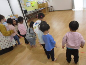 あと2週間少しでにじ組さんに進級です。毎日の生活の中でも「もうすぐにじ組さんだからがんばる」「にじ組さんになったら〇〇する?」などの会話が増えてきました。子どもたちも保育者もドキドキワクワクの毎日です。