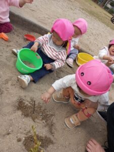 公園では緑がだんだん濃くなってきてかわいいたんぽぽも咲き始めていました。もも組のお友だちは砂場遊びを楽しみました。小枝をみつけて砂に立て、何かに見立てているのでしょうか?新しい創造遊びの始まりを予感させてくれます。お砂場セットのバケツやスコップもとても上手に扱えるようになりましたね。これからもっともっと楽しい遊びが待っているよ。楽しみだね!