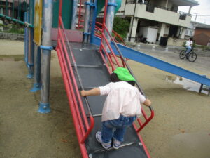 大型遊具は、周りに水たまりができている場所もあったのであらかじめ声をかけました。また、遊具に上ろうとすると靴の裏が濡れているために少し滑りやすくなっているようでした。そんな中、子どもたちは水たまりに足が入らないようにしたり、遊具に上る時に足に力を入れたり、手すりの持ち方を考えたりと自分たちなりに工夫をしながら楽しめる方法を考えているようでした。