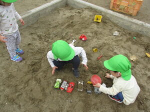 砂場では、車のおもちゃや型抜きを手に遊び始めます。車のおもちゃをお友だちと一緒に駐車場のように並べてやり取りをしていたり、型抜きで砂場の縁に形を並べて「オムライスができたよ」と教えてくれたりするお友だちもいました。