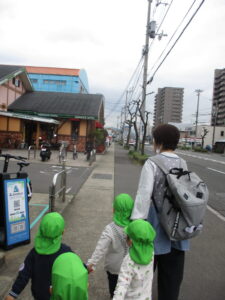 ふたばになったばかりの頃は、公園は好きだけど往復は歩くことが難しく、途中で泣いてしまったりカートに乗りたがったりするお友だちも多かったのですが、そんな姿が思い出せない程、かっこ良く歩くことができるようになり、お友だちや保育者との会話を楽しむ余裕も出てきました。道路脇にある店舗を見て「ここパパとママと行ったよ」と教えてくれたり、お家と同じ種類の車を見つけて喜んだりする姿もあります。
