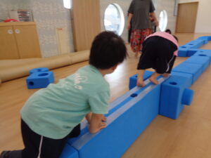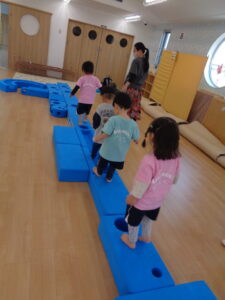 まず始めは、ウレタン積み木の上を落ちないようにゆっくりと慎重に歩いて行きます。