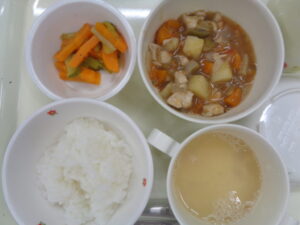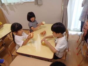 そして、今日はリトミックや英語がありましたがその前にみんなで玉ねぎの皮むきをしました。