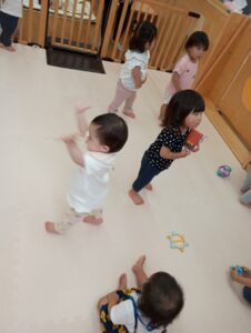 体操でみかん組のお友だちが保育者の手振り身振りを真似しているのを見て一緒にしようとする場面も見られました。