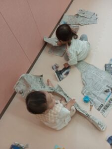 朝のおやつが終わった後、体操で身体を動かしてから新聞遊びをしました。