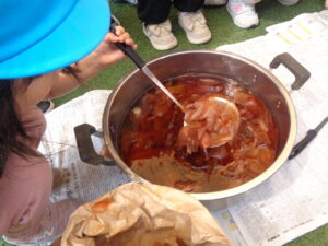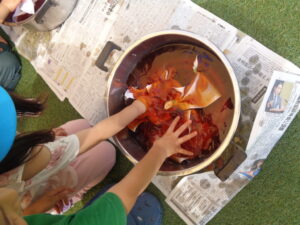先週にじ組のみんなが剥いてくれた玉ねぎの皮を煮だして、玉ねぎ染めに挑戦です☆