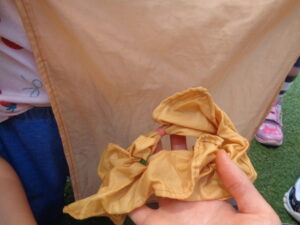 時間がきたので、染まった布を絞り、ミョウバン液に漬けます。すると、あら不思議!!茶色く染まった布が黄色に変身しました😍