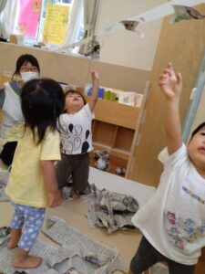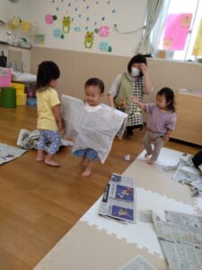 新聞紙をびりびり破いたりボールを作ったり、布団にしたり、先生に作ってもらった洋服や靴を付けてみんな大喜び!!