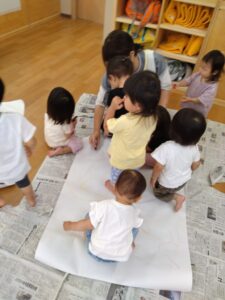 その後保育室に戻ると、大きい新聞紙の上に白い紙が置いてあります・・・