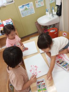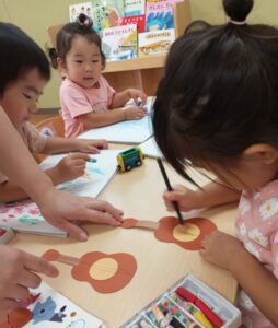 制作が終わるとみんなでお絵描きをして楽しみました。ここでも「ねえ、このいろとって」「はいどうぞ!」