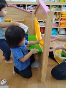 さて、今日のみかん組さんは、ふたば組さんとお部屋を交換して、ままごとで遊びましたよ。