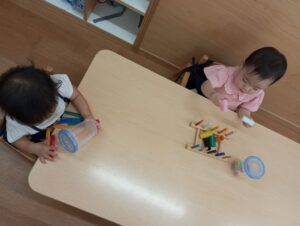 微細遊びではポットン落としの玩具や棒はめの玩具で遊びました。