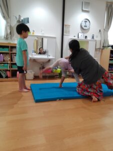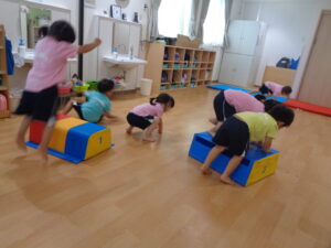 マットに直接できるようになったお友だちもいますが、まだ難しいお友だちは跳び箱を使っての練習をしました。少しずつ「怖い」という気持ちが薄れてきているように見えました。