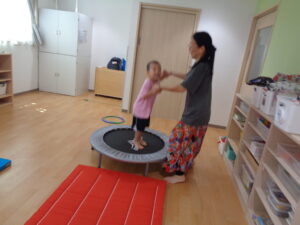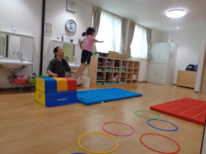 その後は、跳び箱にのぼってジャンプ→ケンケンパーをしました。跳び箱にのぼる時、助走して足を開いて跳び箱に飛び乗れるお友だちもいて、跳び箱を跳べるようになる姿が想像できました。そして、みんな ジャンプもきれいに着地できるようになってきました。途中から、間にトランポリンが入ってきました。最初は、ふらついていたお友だちも回数を重ねるごとにまっすぐ上にジャンプできるようになっていきました。