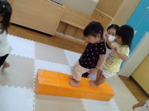 平均台に登ってバランスを取りながら歩くのも、上手になってきました!