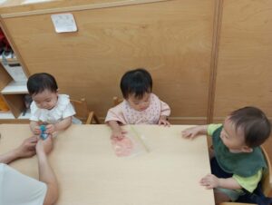 保育者が平たくしてあげると、パンパン!とおもちつきのように、手で思いきりたたいたり、おいしそうで思わず食べてしまいたくなるお友だちもいましたよ。
