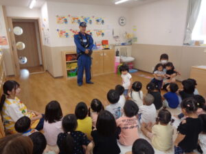 消防車の色々な車の中の仕組みをお話してもらい、消防士さんのお顔をしっかり見て、真剣に聴いている姿がとても印象的でした。