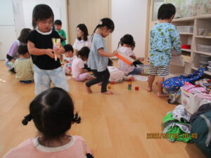 今日のふたば組さんは大きいお兄さん、お姉さんのいるにじ組さんのお部屋に行って一緒に遊びましたよ。