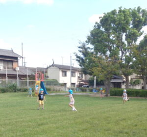 年中さん、年長さんは大好きなおにごっこやかくれんぼをして楽しんでいます。公園中を走り回って捕まえたり捕まったり。その度に「ヤッター」と歓声をあげたり「捕まった」と悔しそうな声を出したり大忙しです。ほんの5分走っただけでも汗びっしょり。今年の夏も本当に暑くて全然公園に行けなかったのでその時間を取り戻すかのように遊んでいました。