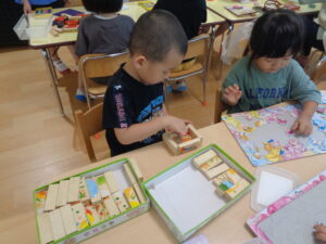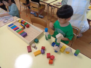 まだ、暑さが残っているので早めに切り上げ、お部屋にもどり室内あそび。それぞれに折り紙、粘土、カプラ、積み木、パズルと自分のやりたい事を見つけて、お友だちと誘い合いながら好きな遊びを楽しんでいました。積み木や粘土では、年中さんや年長さんは想像力を働かせて様々な形を創り上げていく様子がありました。年少さんは、そんな様子を憧れの眼差しで見て、そこから自分も同じようにやってみようとする姿があります。これからどんどん色々なことを吸収していくのでしょうね。楽しみです。