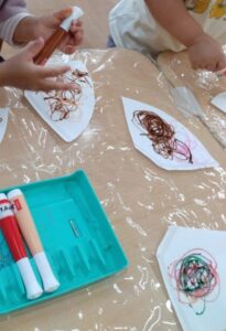 室内では制作をしました。コーヒーフィルターに水性ペンで好きな色を手に取って描きました。それを水に放つとあら不思議!どんどん滲んで色が混ざっていきますよ。何ができるかお楽しみに(^^♪