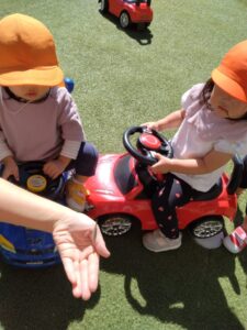本日は10月10日。61年前の同日、東京国立競技場で東京オリンピックの開会式がおこなわれました。当時の会場は東京オリンピック2020のため、取り壊され、2019年に新国立競技場が建てられました。みかん組のお友だちは園庭でかけっこ。未来のオリンピアンの卵たちです。みんな走ることが得意。保育者が待て待てと追いかけるとずっと走り続けていました。それから、車遊びもしました。車も台数が限られているので「かして」「あとで」とのやり取りの後「どうぞ」と言ってかしてあげていましたよ。優しい気持ちが育っていますね(^_-)-☆バッタさんも遊びに来ていましたよ。じ~っと見つめて観察中。