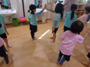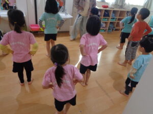 覚えている子は多く、終始笑顔でとっても楽しそうに踊っていました。2人組になって踊るところもあり、大人の動きをよく見ながら協力して取り組んでいましたよ😊