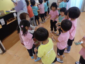 保育者の真似をして、年齢別に鳴らすのは少し難しそうでしたがお友だちと「やったー!!できたね」とお話していて成長を感じました。