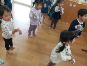 おもちゃのチャチャチャ♪に合わせて上手に鳴らしていましたよ👏