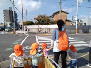 みかん組のお友だちは避難訓練をおこないました。いつものお散歩とは違う状況を察して、すばやい行動ですみやかに避難することができましたよ。